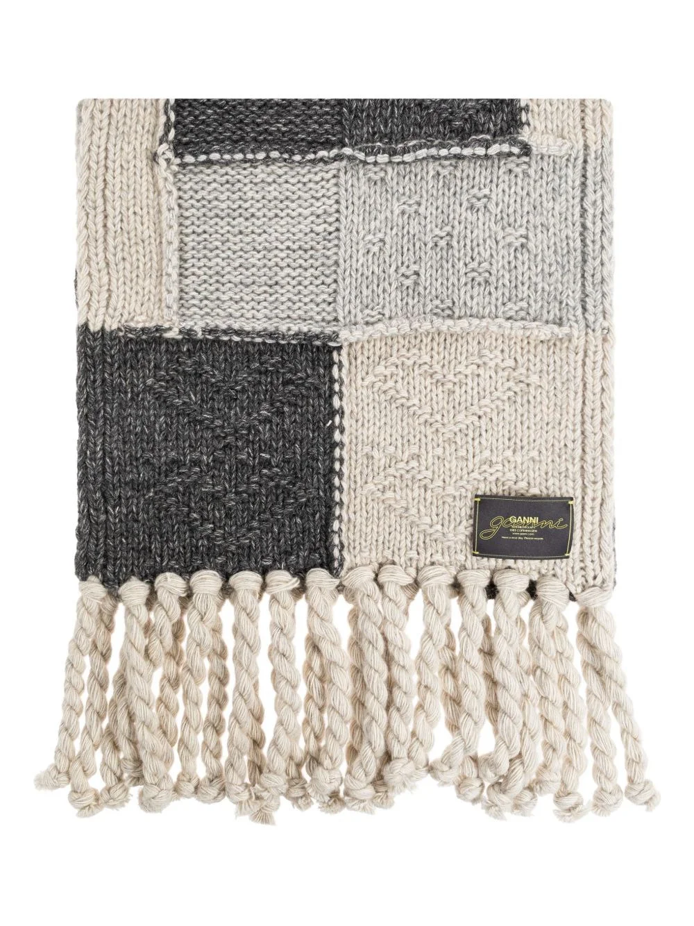 patchwork fringed scarf Highlights - Grey/multicolor - Patchwork design - Knitted - Fringed trim Imported Composition Wool 55%, Organic Cotton 45% SIZE & FIT Measurement LENGTH 43.3 in(110 cm) WIDTH 17.71 in(45 cm) Washing instructions Hand Wash