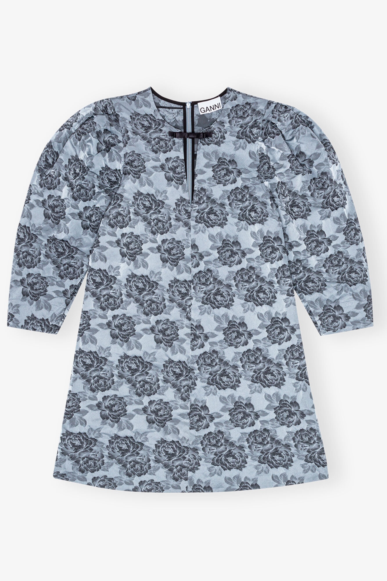 This Blue Jacquard A-Line Mini Dress features a keyhole neckline with a decorative bow detail, puffed three-quarter sleeves, and an all-over floral print in shades of blue and black. DETAILS - 50% recycled polyester, 45% polyester, 5% polyamide. Learn more about our materials - Keyhole neckline - Decorative bow detail Made in: China Product ID: W0040 SIZE & FIT - Regular fit - Zoey is 5’10” and wears a size S