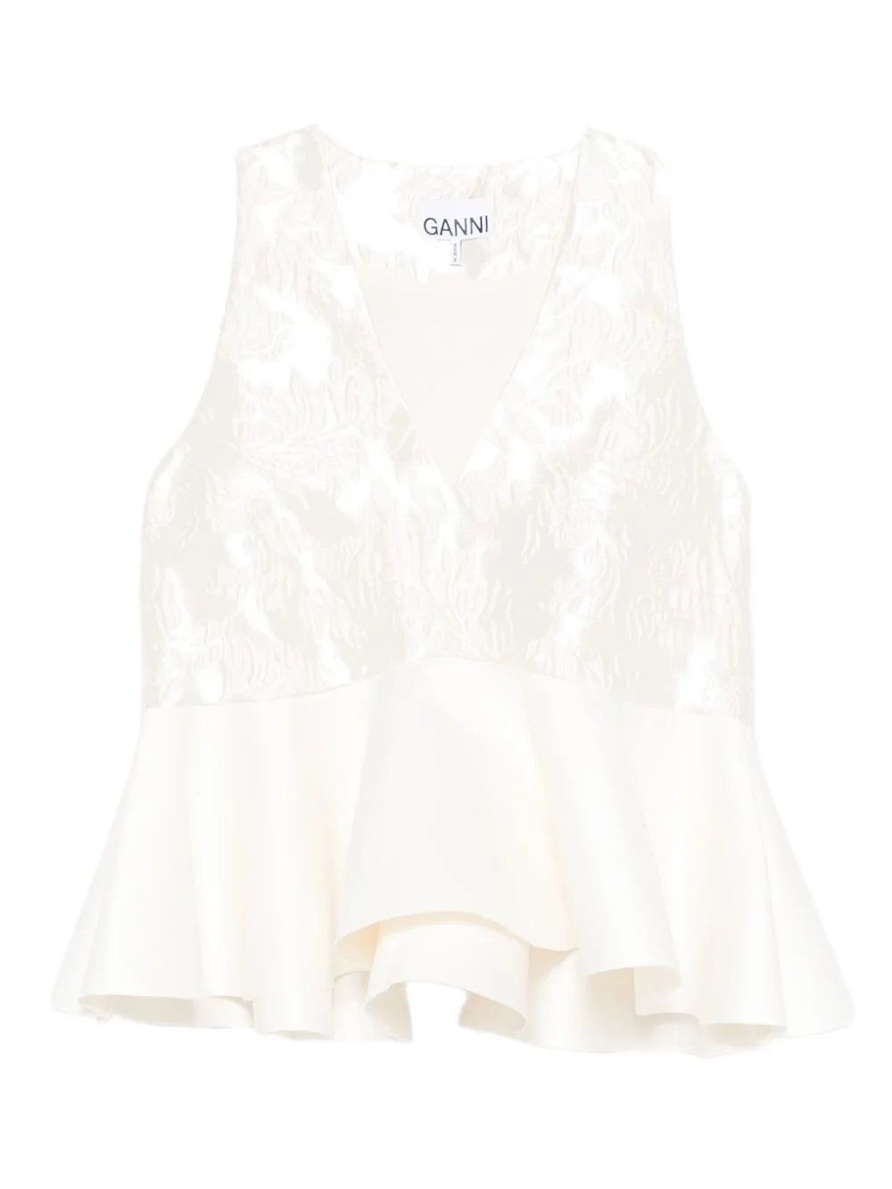 satin cloque peplum top Highlights - White - Floral detail - V-neck - Sleeveless - Tiered hem Imported Composition Recycled Polyester 90%, Polyamide 10% SIZE & FIT Model measurements Height 5 ft 11 in(1.8 m) Bust/Chest 32.28 in(82 cm) Hips 36.22 in(92 cm) Waist 25.19 in(64 cm) Washing instructions Hand Wash