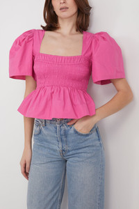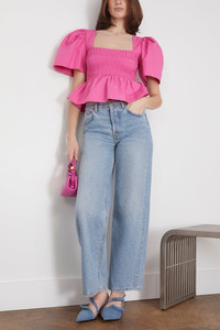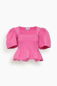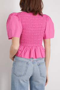 The Ganni Cotton Poplin Open-neck Smock Blouse is a playful addition to your wardrobe. You'll love the feminine smocked bust and puffed sleeves of this cotton blouse. Wear yours with the matching skirt and heels. - Fits true to size, take your normal size - Smocked bust - Puffed sleeves - Peplum waistline - Cropped length - 100% Organic cotton