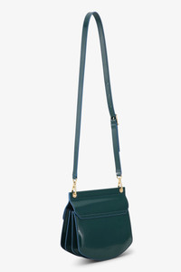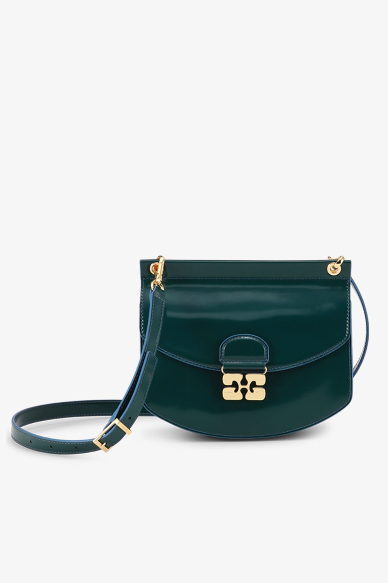 This Small Apo-G Bag comes in a green color with a glossy finish. The bag features a magnetic closure with a GANNI Butterfly gold-tone clasp and a detachable strap, allowing for versatile wear as a shoulder bag or clutch. The compact interior has a slip pocket and three main compartments, one of which has a zip closure. DETAILS - 65% recycled leather, 19% polyurethane fibre, 16% polyester. Learn more about our materials - Adjustable and removable shoulder strap - GANNI Butterfly gold-tone clasp - Magnetic closure - Three main compartments, one equipped with a zip closure - Slip pocket Made in: China Product ID: A6461