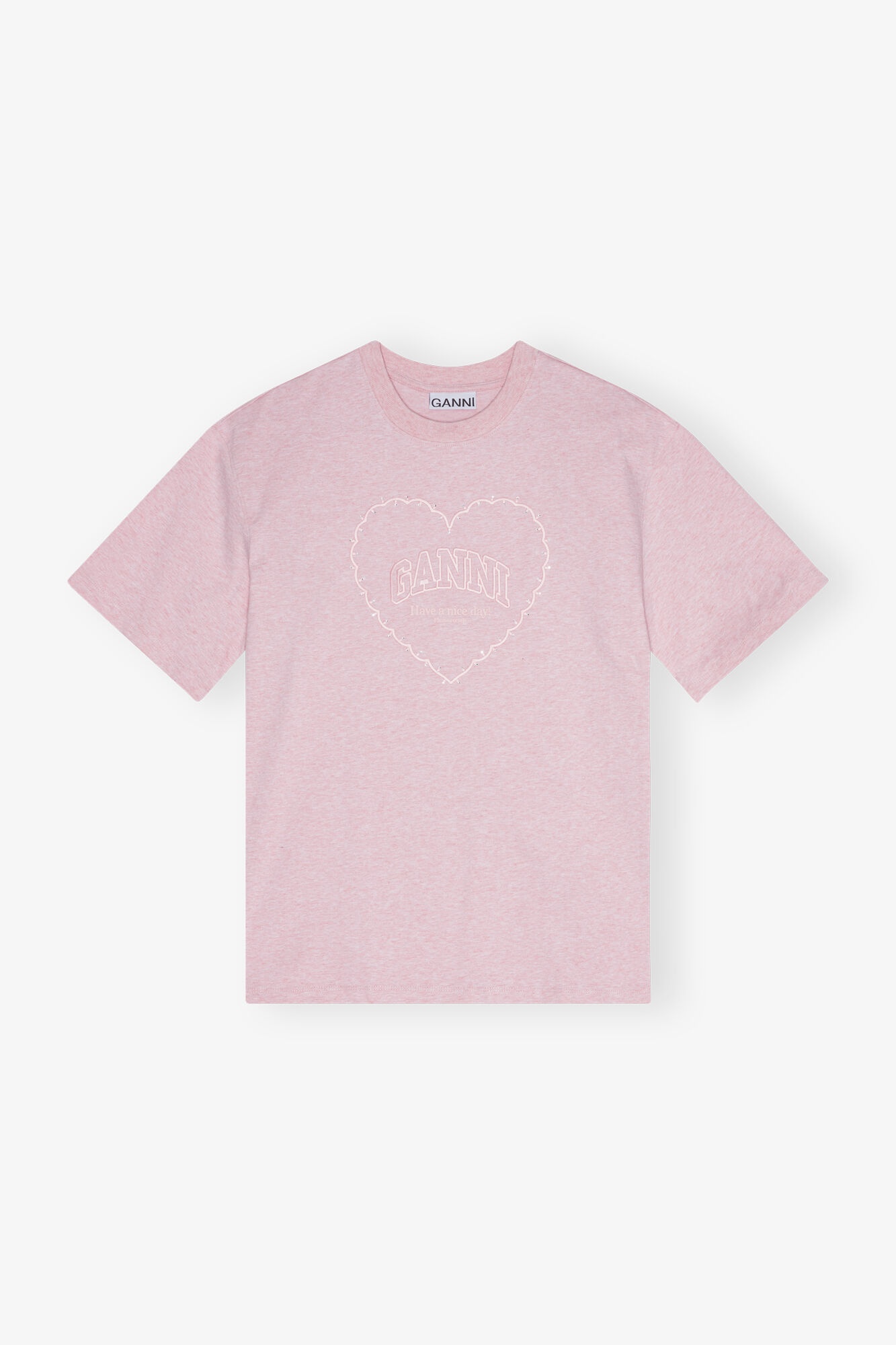 This Pink Heavy Cotton Drop Shoulder Heart T-shirt features a round neckline, short sleeves, an embroidered heart with a GANNI logo and the phrase 'Have a nice day! Please recycle.' DETAILS - 100% organic cotton. Learn more about our materials - Crew neck - Short sleeves with dropped shoulders - Embroidered heart with GANNI logo Made in: Portugal Product ID: T4090 SIZE & FIT - Paulina is 5’10” and wears a size S