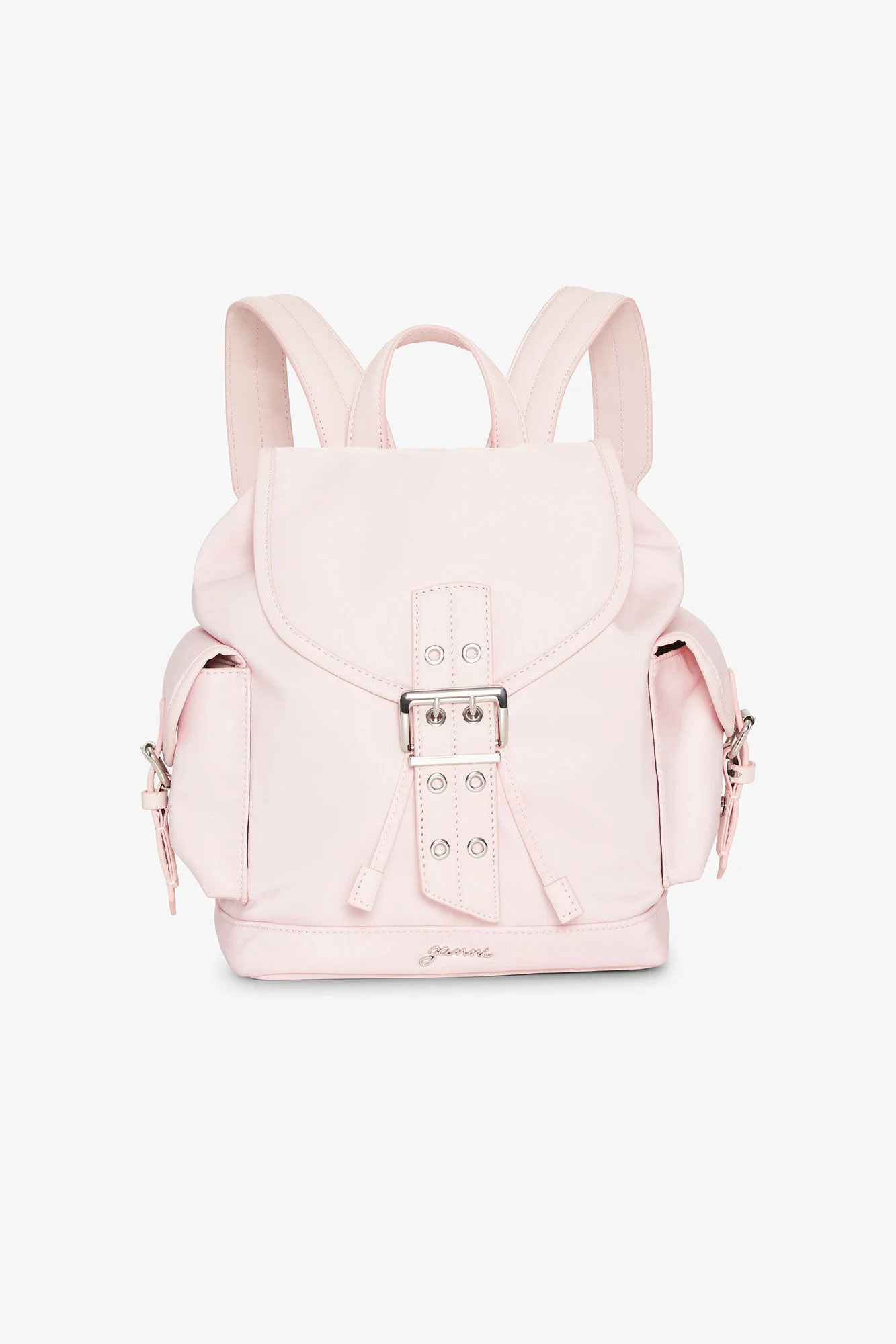 This Pink Small Bucky Backpack Nylon is made from recycled nylon. The backpack features a top handle, adjustable shoulder straps, a foldover top, front buckle fastenings, a drawstring closure, two side pockets and a GANNI logo. DETAILS - 100% recycled nylon. Learn more about our materials - Lining composition: 100% recycled polyester - Top handle - Adjustable shoulder straps - Drawstring closure - Two side pockets - Foldover top - Front buckle fastenings Made in: China Product ID: A6618 SIZE & FIT - Height: 24 - Width: 21 - Depth: 13