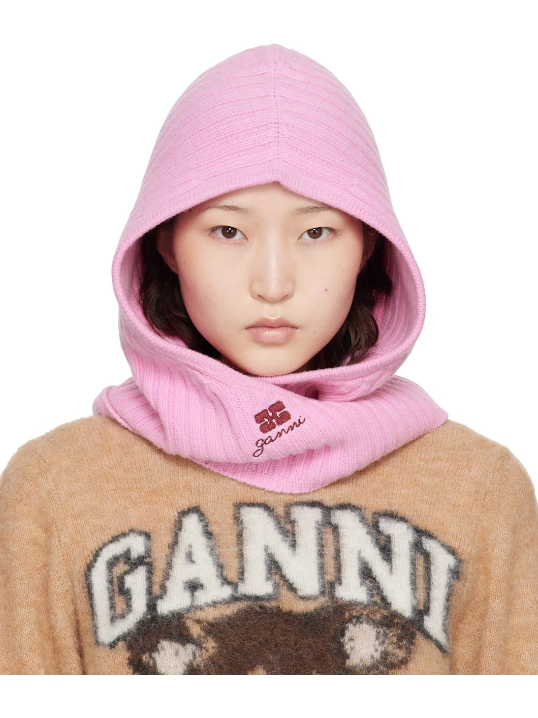 Rib-knit wool- and CIRCULOSE® viscose-blend balaclava. · Logo embroidered at face · Scarf-style self-tie straps Supplier color: Aurora Pink 60% wool, 40% viscose. Made in Moldova 261144F014004