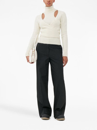 pinstripe-pattern wide-leg trousers Adorned with a timeless pinstripe pattern throughout, these black trousers from GANNI are spun from a blend of recycled polyester and cut to a relaxed wide-leg silhouette. Highlights - Black - Recycled polyester blend - Pinstripe pattern - Mid-rise - Belt loops - Two side slit pockets - Wide leg - Rear patch pocket Imported Composition Recycled Polyester 61%, Viscose 32%, Elastane 6%, Polyester 1% SIZE & FIT Measurement FRONT RISE 12.99 in(33 cm) INSIDE LEG 30.7 in(78 cm) HIPS 52.75 in(134 cm) WAIST 45.66 in(116 cm)