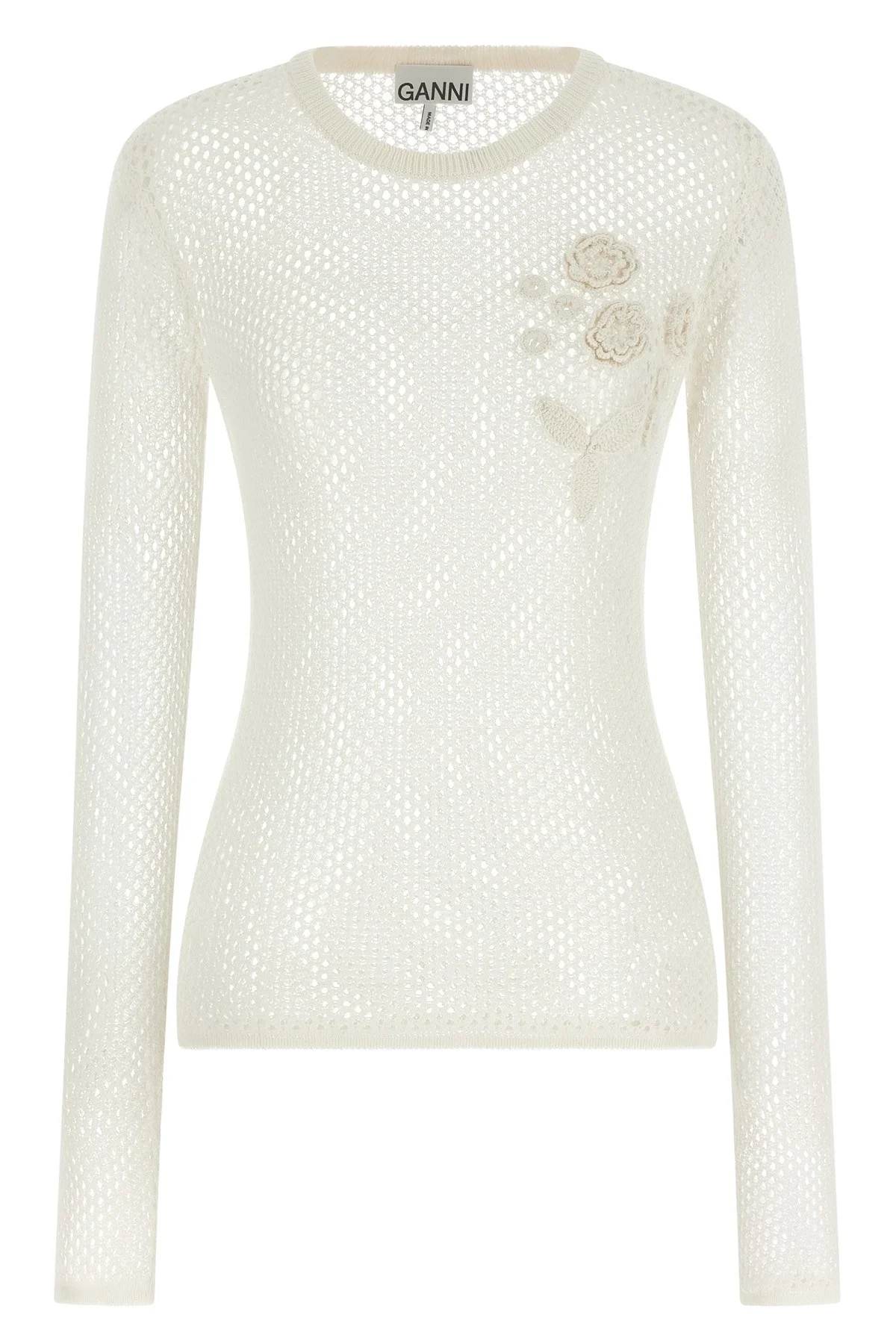 cod. A1070231135 Cotton mesh pointelle sweater with front floral 3D applications, round neckline, long sleeves. SUSTAINABLE: This product is made of organic cotton. Color: White Size & Fit: true to size fit Composition: 100% organic cotton Made in: China
