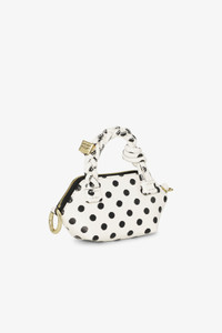 This Polka-Dot Nano GANNI Bou Bag features a tone-on-tone metallic GANNI Butterfly logo, a twisted handle with a braided knot, and a gold-tone metallic dice with a GANNI Butterfly logo engraved. The bag has a zipper closure at the top and a removable wrist strap. The bag is suitable for small essentials like keys, coins, or lip balm. DETAILS - 65% recycled leather, 19% polyurethane fibre, 16% polyester. Learn more about our materials - Lining composition: 65% Recycled Cotton 35% Cotton - Braided strands with a braided knot - Removable wrist strap - Zip-around closure - Tone-on-tone GANNI Butterfly logo - GANNI embossed logo on the back of the bag - Metallic dice with a GANNI and Butterfly logo engraved Made in: China Product ID: A6614 SIZE & FIT - Strap length: 52 - Height: 9.5 - Width: 12 - Depth: 2.5