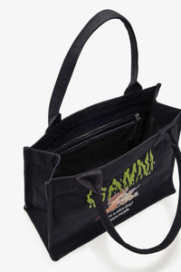 This tote bag features top handles, one large compartment, and a GANNI logo with a printed pony illustration and the phrase 'Have a nice day! Please recycle'. DETAILS - 100% Recycled Cotton Learn more about our materials - Lining composition: 100% Recycled Cotton - Canvas material - Printed pony illustration - Top handles - One compartment - Inside zipped pocket - GANNI logo - 'Have a nice day! Please recycle' message Made in: India Product ID: B2110043 SIZE & FIT - Strap length: 25 cm - Height: 31 cm - Width: 40 cm - Depth: 17 cm - Designed to hold an iPhone 16 Pro Max, wallet, sunglasses, keys, water bottle, pouch, gym clothes, 15” laptop