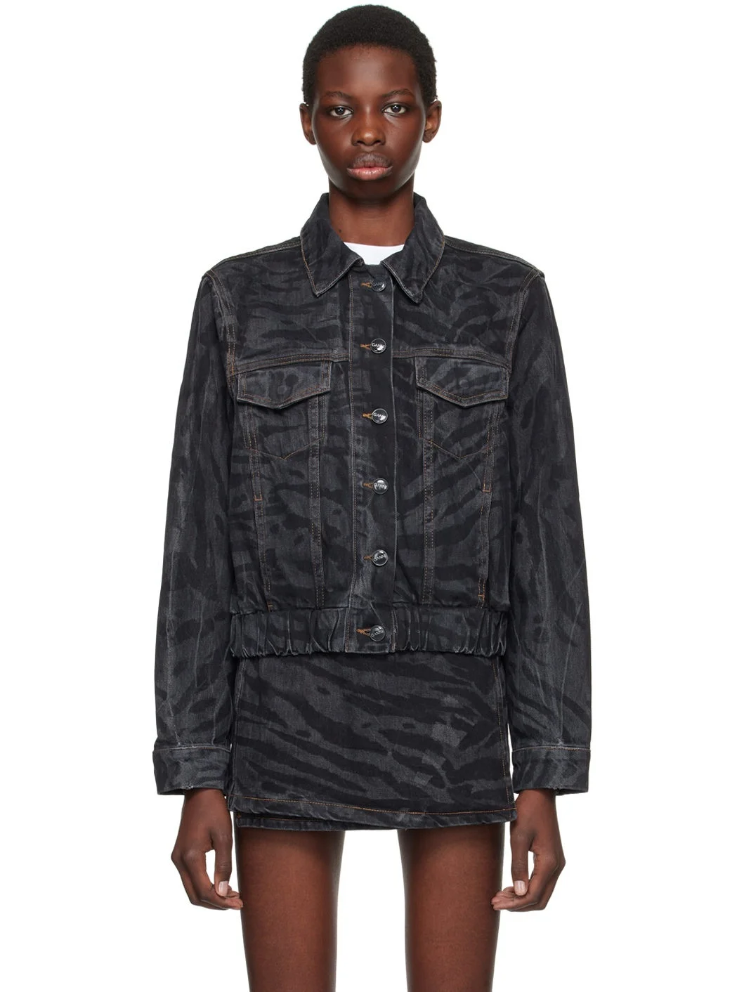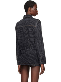 Non-stretch organic cotton denim jacket. Faded zebra pattern throughout. · Spread collar · Button closure · Flap and seam pockets · Elasticized hem · Single-button barrel cuffs · Patch pockets at interior · Embroidered logo patch at back · Logo-engraved silver-tone hardware · Contrast stitching in tan Supplier color: Black 100% organic cotton. Made in Turkey 242144F060000