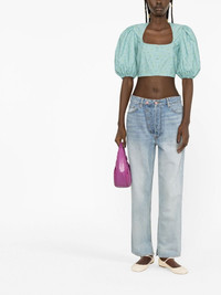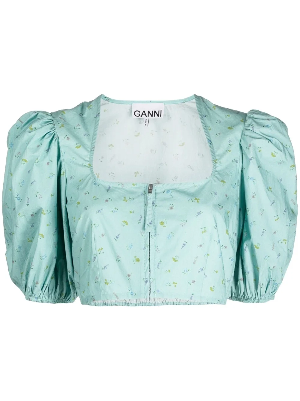 floral-print cropped blouse Characterised by its all-over ditsy floral print, this blouse by Scandinavian brand Ganni is crafted from organic cotton for a more conscious choice. Short puff sleeves and cropped silhouette evoke a romantic feel. Highlights - Turquoise blue-green - Organic cotton - Ditsy floral print - Scoop neck - Front zip fastening - Short puff sleeves - Cropped Imported Composition Organic Cotton 100% SIZE & FIT Model measurements Height 5 ft 10 in(1.79 m) Bust/Chest 31.1 in(79 cm) Hips 35.03 in(89 cm) Waist 24.01 in(61 cm) FittingInformation Designed for a slim fit that sits just away from the body offering a close yet comfortable fit Made from a midweight non-stretch fabric This piece fits true to size – take your usual size Washing instructions Machine Wash