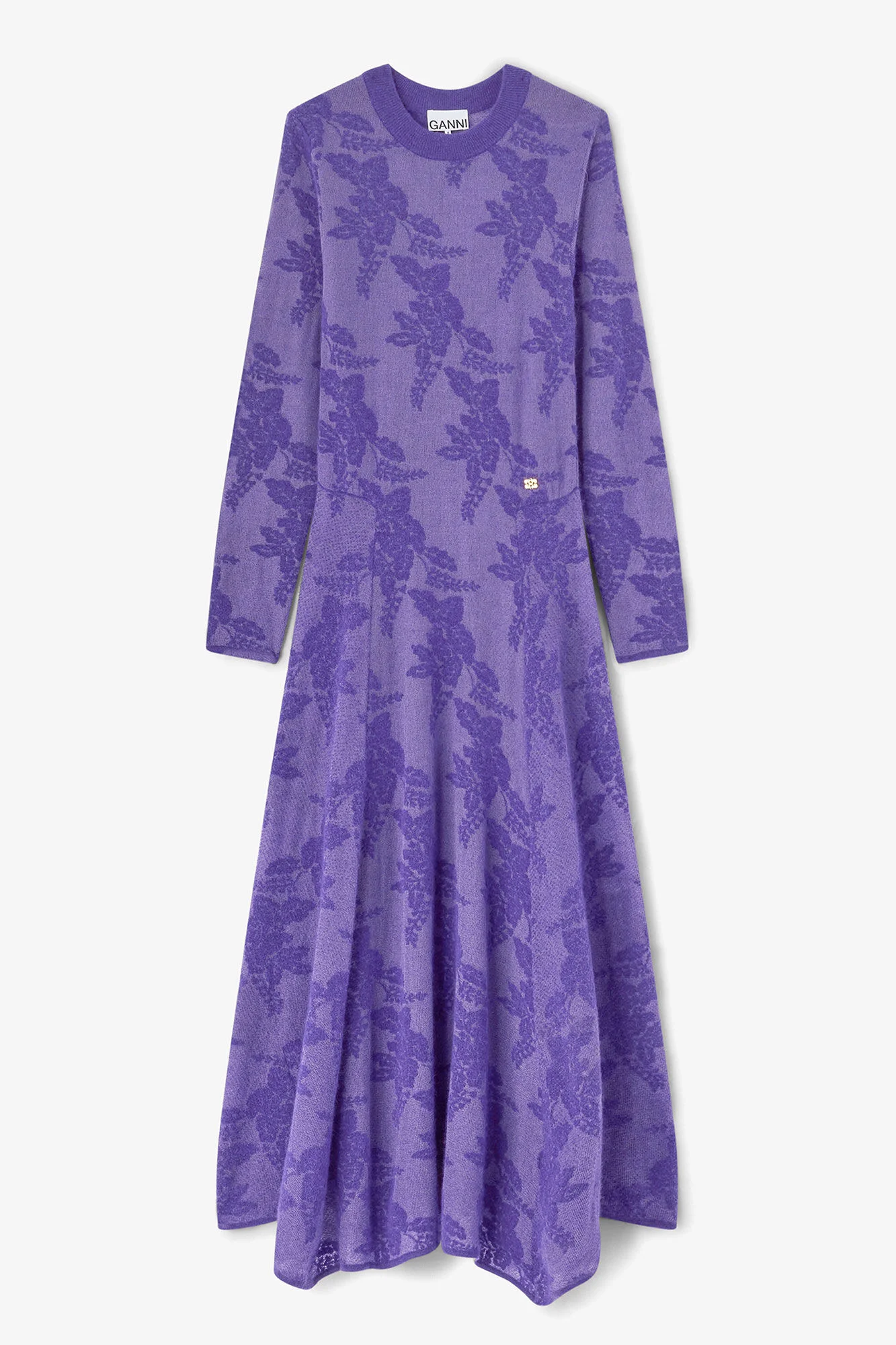 This dress features a sheer flower print, round neckline, long sleeves and a GANNI logo. DETAILS - 39% Alpaca, 30% Polyamide, 16% Wool, 15% Recycled Polyamide Learn more about our materials - Sheer flower print - Round neckline - Long sleeves - GANNI logo Made in: Italy Product ID: A1030183 SIZE & FIT - Regular fit - Mini - Yaniris is 5’11” and wears a size S