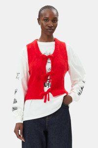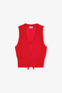 This Red Tie String Vest features an open round neckline with tie bands, ribbed edges and an embroidered GANNI logo. DETAILS - 55% mohair, 29% recycled polyamide, 16% merino. Learn more about our materials - Open round neckline with tie bands - Sleeveless - Ribbed edges - Embroidered GANNI logo Made in: China Product ID: K2344 SIZE & FIT - Tonia is 5’9” and wears a size S