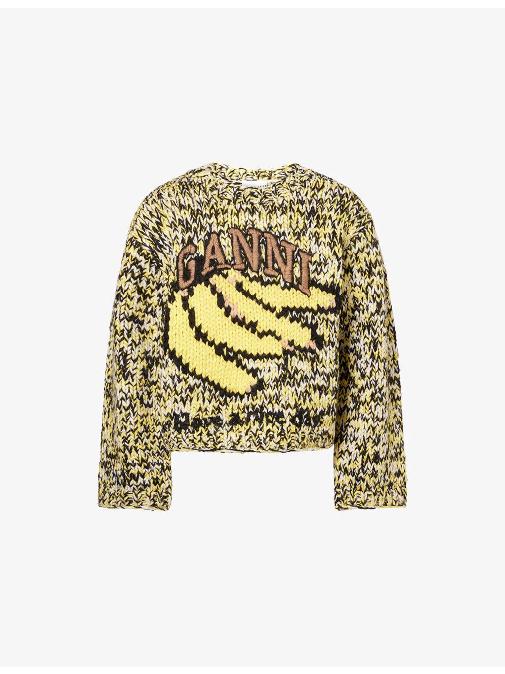 PRODUCT DETAILS - GANNI wool jumper - 100% wool - Relaxed fit, round neck, long sleeves, embroidered logo at front - Hand wash - True to size - Model is 5ft 10in/1.78m and wears a size small - Heavyweight, slight stretch Ref: R04574984