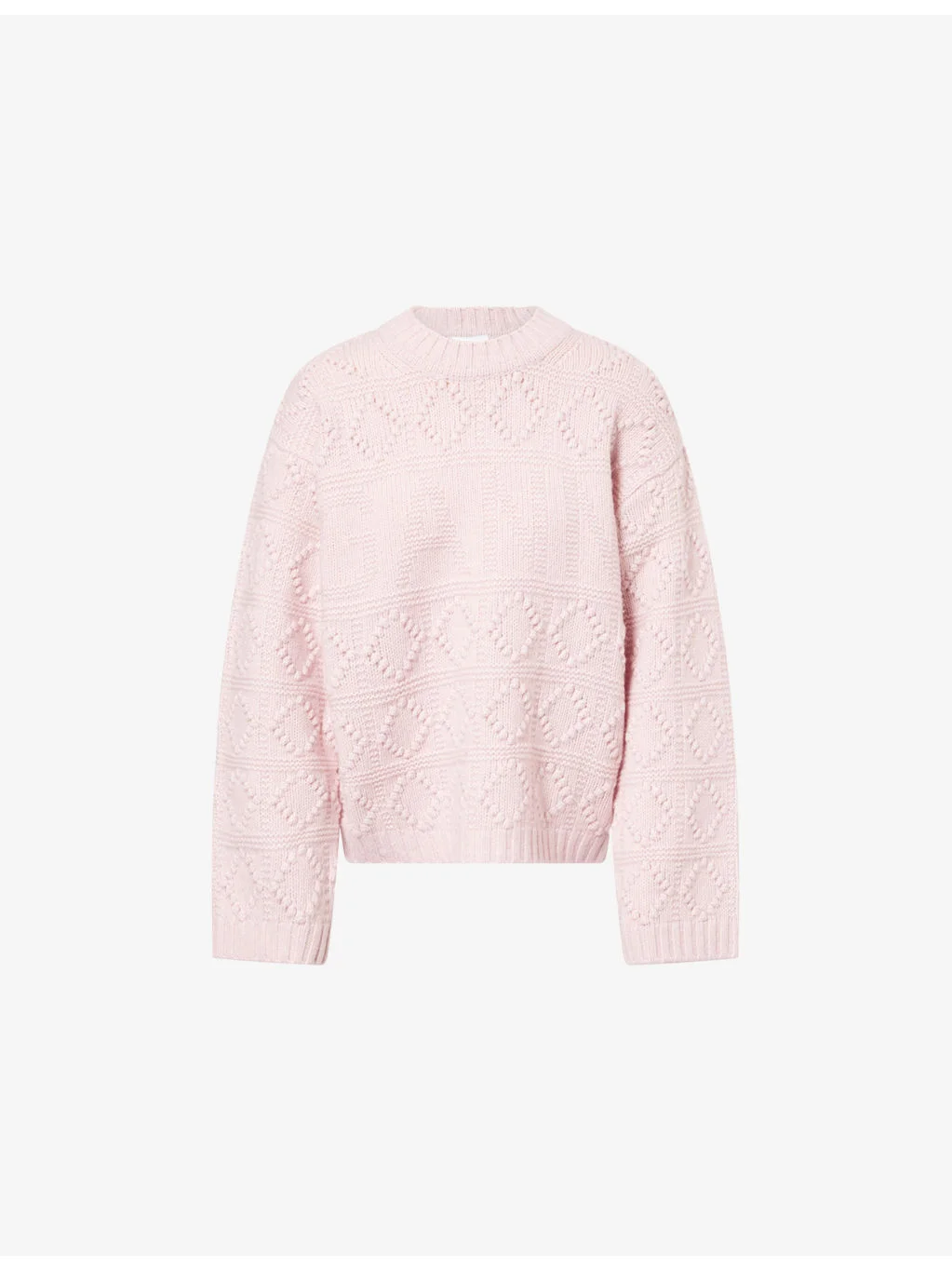 PRODUCT DETAILS - GANNI wool-and-cotton jumper - 55% wool, 45% cotton - Relaxed fit, round neck, long sleeves, all-over textured pattern - Hand wash - True to size - Model is 5ft 10in/1.78m and wears a size small - Midweight, slight stretch Ref: R04574981
