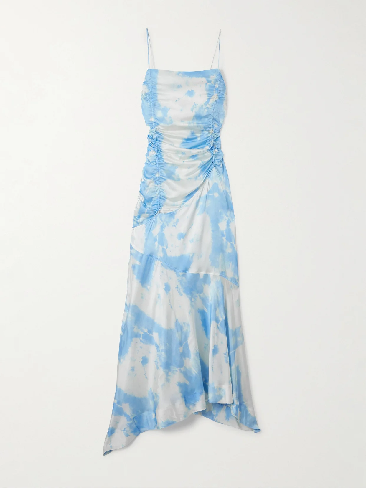 GANNI's dress is cut from recycled-satin dappled with clouds against a clear blue sky. It has a ruched bodice held by pin-thin spaghetti straps and falls to a floaty asymmetric hem. Echo the Spring '24 runway styling by wearing yours with silver cowboy boots.