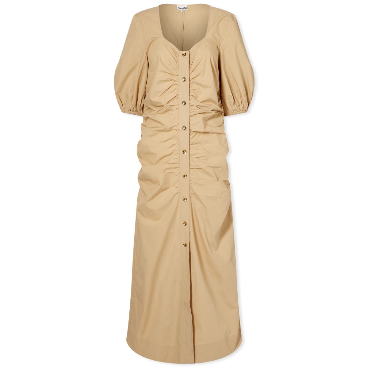 From the streets of Copenhagen to its very own runway, GANNI has proved itself a master of balancing trends since 1999. Just take this maxi dress for example - where Scandi tradition is upheld using a neutral colourway and symmetric cut - while ruched details and elasticated elbow length sleeves enhance its contemporary appeal. - 100% Organic Cotton - Maxi Length - Button Closure