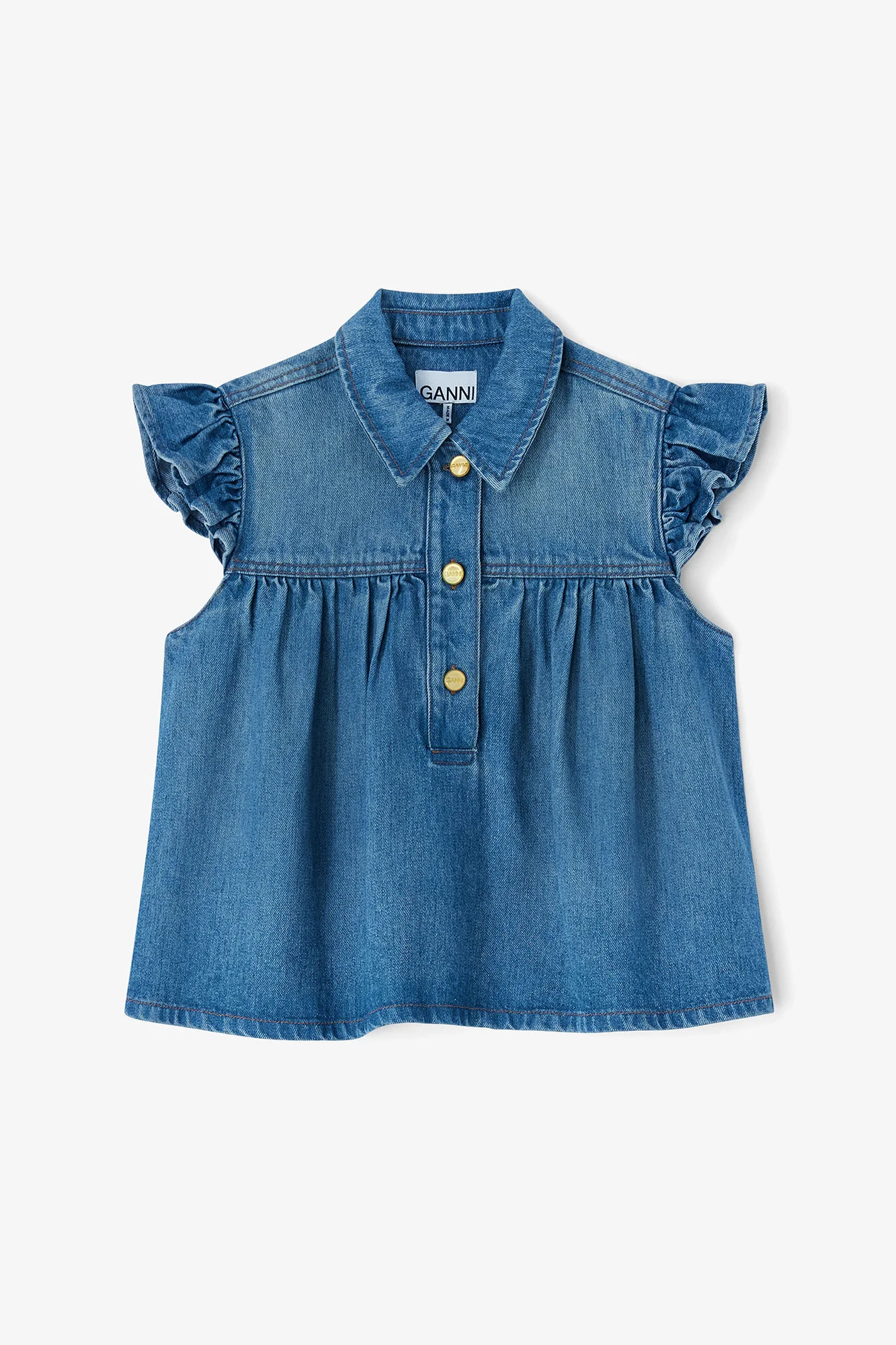 This denim top features a collar, ruffled sleeves and a button-front closure. DETAILS - 100% TENCEL™ Lyocell Learn more about our materials - Lining composition: 100% Organic Cotton - Classic collar - Button-front closure - Short sleeves - Gold-tone buttons Made in: Turkey Product ID: A1040047 SIZE & FIT - Regular fit - Lisa Lu is 5’10” and wears a size US 4