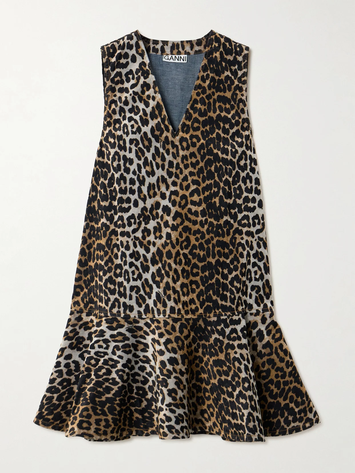 In the eyes of leopard-print enthusiasts, GANNI can do no wrong. Made from recycled-denim and flocked for texture, this mini dress flares to a ruffled peplum mini hem. Team yours with equally bold accessories to stay true to the brand's eye for maximalism.