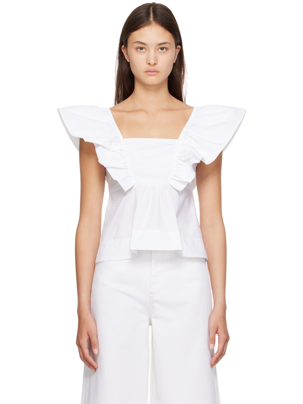 Organic cotton poplin tank top. · Square neck · Ruffles at elasticized armscyes · Gathering at waist · Smocking at back Supplier color: Bright white