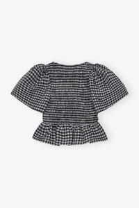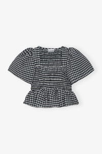 This Seersucker Check Open-neck Smock Blouse features a square neckline, short puff sleeves and a smock bodice. DETAILS - 45% recycled polyester, 40% organic cotton, 14% polyamide, 1% elastane. Learn more about our materials - Square neckline - Puff sleeves Made in: Turkey Product ID: F9309 SIZE & FIT - Designed for a form-fitting silhouette, tight throughout - Fits true to size, take your normal size - Mona is 5’9” and wears a size US 4