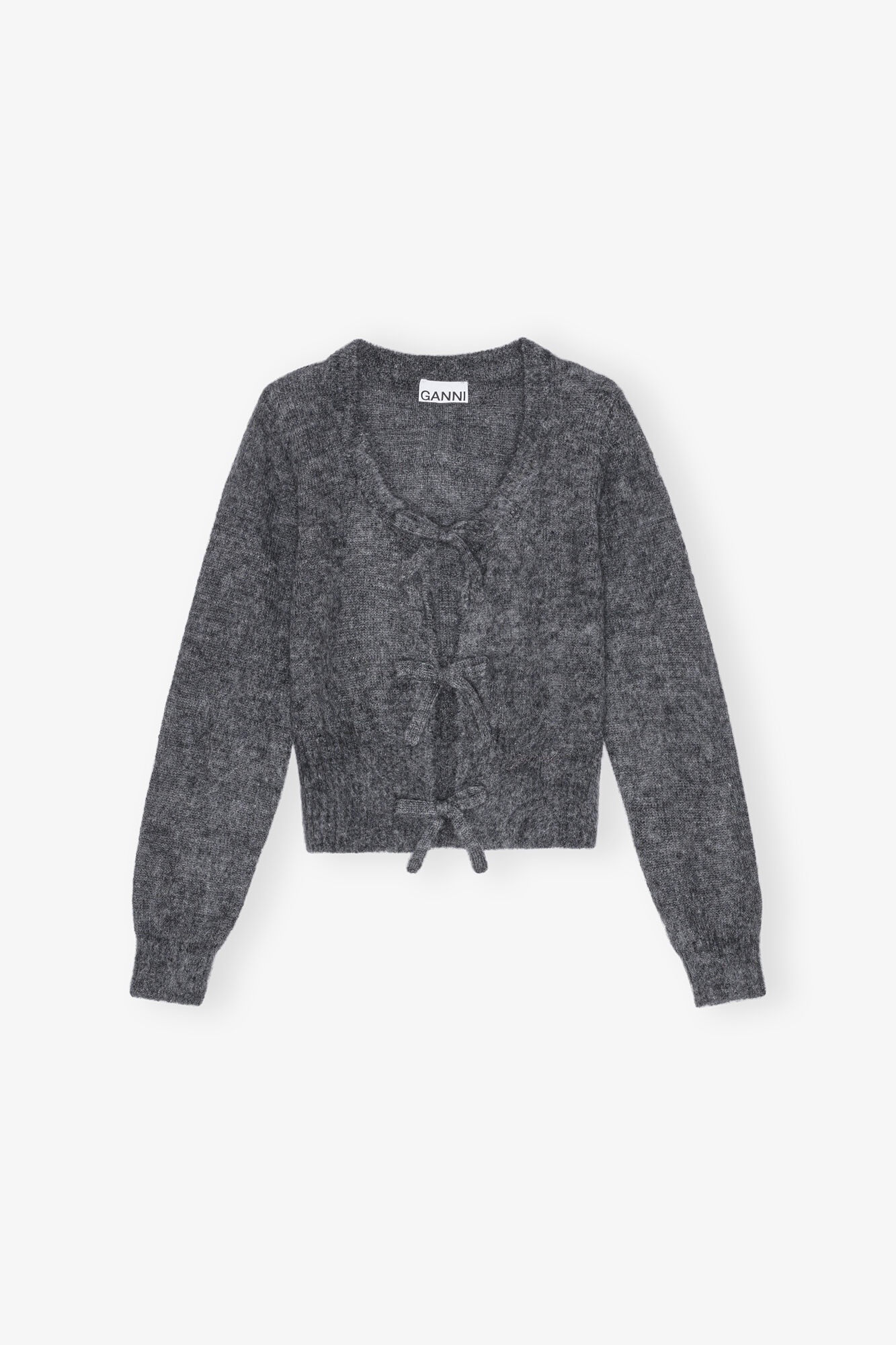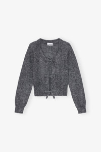 This Grey Light Mohair Tie String Cardigan features an open round neckline with tie bands and long sleeves. The cardigan has ribbed edges and an embroidered GANNI logo. DETAILS - 55% mohair, 29% recycled polyamide, 16% merino. Learn more about our materials - Open round neckline with tie bands - Long sleeves - Ribbed edges - Embroidered GANNI logo Made in: China Product ID: K2411 SIZE & FIT - Regular fit - Tonia is 5’9” and wears a size S