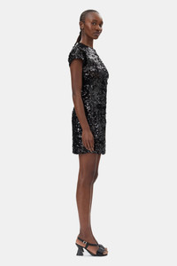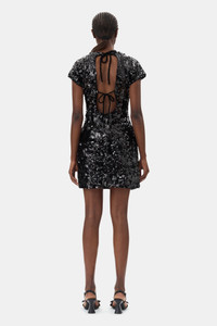 This Black Velvet Sequins Mini Dress features a high, round neckline and cap sleeves. The dress has an open back with a tie detail. DETAILS - 97% recycled polyester, 3% spandex. Learn more about our materials - Lining composition: 100% Recycled Polyester - High, round neckline - Short sleeves - Sequins Made in: China Product ID: T4045 SIZE & FIT - Slim fit - Tonia is 5’9” and wears a size US 4