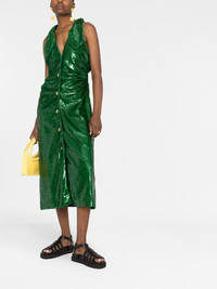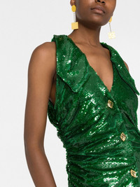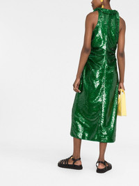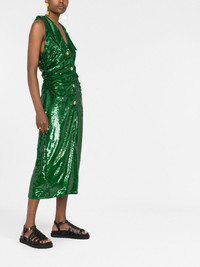 sequin ruched midi dress Highlights - Emerald green - Recycled polyester - Sequin embellishment - Embossed gold-tone buttons - Ruched detailing - Straight-point collar - Sleeveless - Calf-length Imported Composition Outer: Recycled Polyester 100% Lining: Recycled Polyester 100% SIZE & FIT Model measurements Height 5 ft 11 in(1.8 m) Bust/Chest 31.49 in(80 cm) Hips 36.61 in(93 cm) Waist 24.4 in(62 cm) Measurement HIPS 37.79 in(96 cm) LENGTH 48.81 in(124 cm) WAIST 29.13 in(74 cm) FittingInformation This piece fits true to size. We recommend you get your regular size Designed for a close fit at the bust, waist and hips Made with a mid-weight fabric Washing instructions Hand Wash