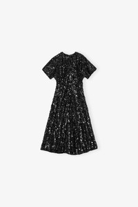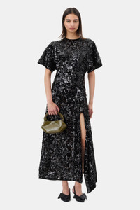 This Black Velvet Sequins Long Dress features a round neckline and short sleeves. The dress has a high slit and sequins. DETAILS - 97% recycled polyester, 3% spandex. Learn more about our materials - Lining composition: 100% Recycled Polyester - Round neckline - Short sleeves - High slit - Sequins Made in: China Product ID: T4044 SIZE & FIT - Designed for a slim fit - Paulina is 5’10” and wears a size US 4