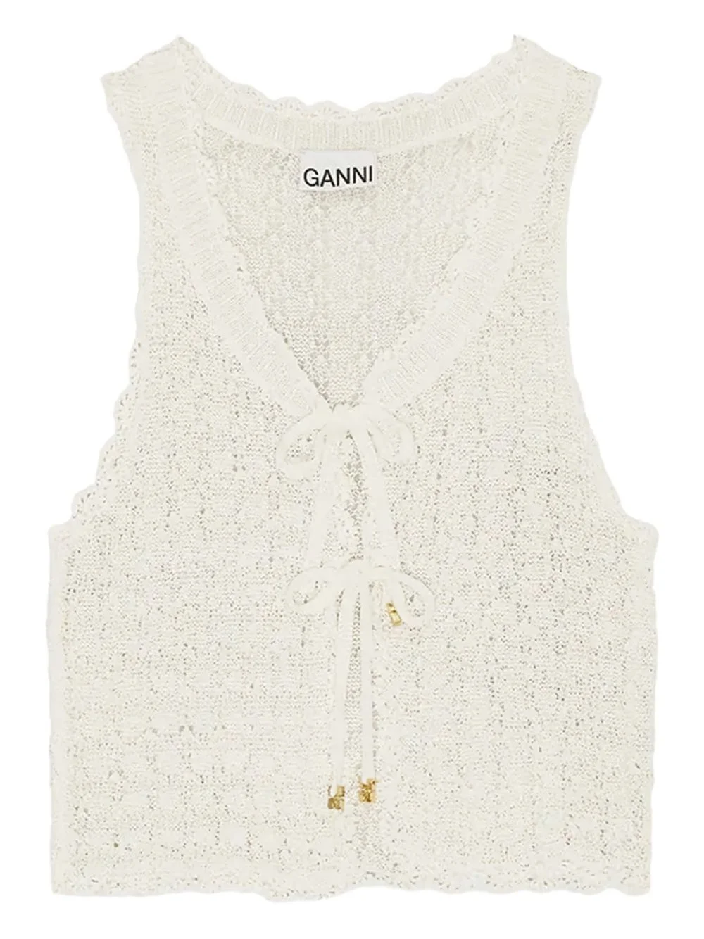 pointelle-knit vest Highlights - Light beige - Front tie fastening - V-neck - Sleeveless - Scallop hem Imported Composition Viscose 77%, Recycled Nylon 23%