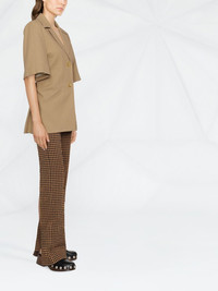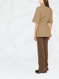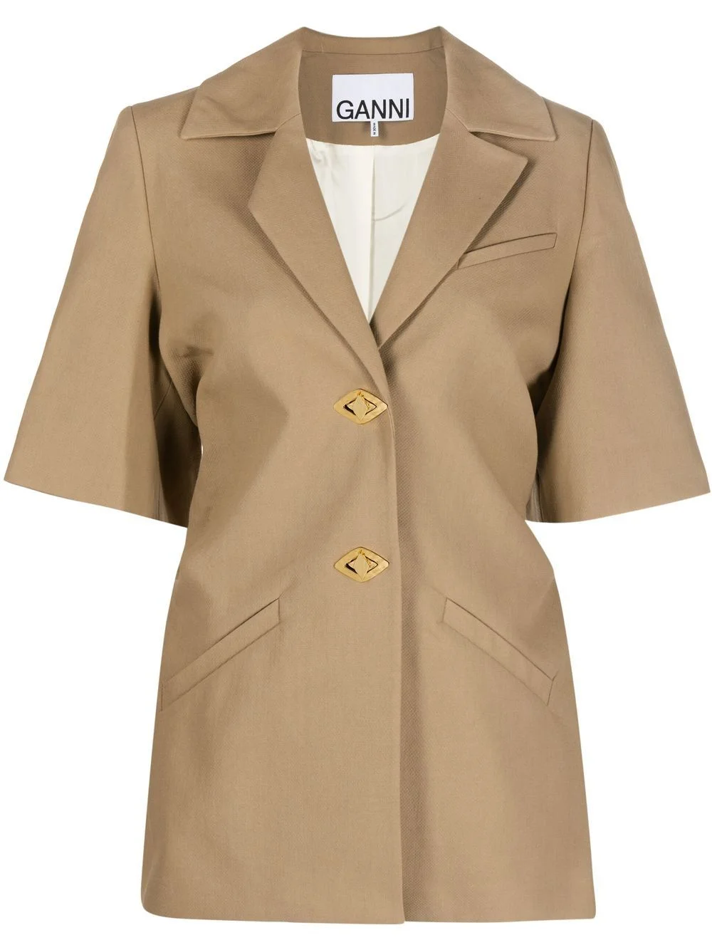 short-sleeve single-breasted blazer GANNI refreshes the traditional notion of tailoring with pieces such as this short-sleeved blazer. Made from organic cotton, this single-breasted jacket is secured using gold-tone twist-lock buttons. Highlights - Short-sleeve single-breasted blazer from ganni featuring brown, organic cotton, tailored cut, notched lapels, jetted chest pocket, short sleeves, front button fastening and two front welt pockets. Imported Composition Outer: Organic Cotton 100% Lining: Viscose 100% SIZE & FIT Model measurements Height 5 ft 10 in(1.77 m) Bust/Chest 31.49 in(80 cm) Hips 33.85 in(86 cm) Waist 22.44 in(57 cm) FittingInformation This piece fits true to size. We recommend you get your regular size Cut for a slim fit Made with a mid-weight non-stretch fabric Washing instructions Dry Clean Only