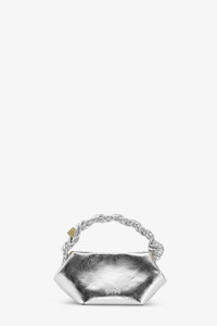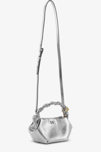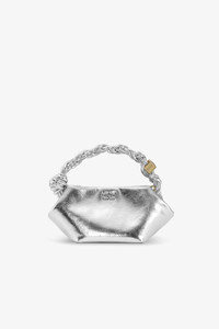 This Silver Mini GANNI Bou Bag features a tone-on-tone metallic GANNI Butterfly logo, a twisted handle with a braided knot, and a gold-tone metallic dice with a GANNI Butterfly logo engraved. The bag has an internal magnetic closure, a flat card pocket inside, and an adjustable and removable shoulder strap for crossbody wear. DETAILS - 58% recycled leather, 25% polyester, 17% polyurethane. Learn more about our materials - Lining composition: 65% Recycled Cotton 35% Cotton - Adjustable and removable shoulder strap - The metallic color may change when exposed to sunlight Made in: China Product ID: A5653 SIZE & FIT - Strap length: 50 - Height: 11 - Width: 25 - Depth: 11.5