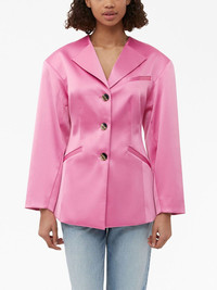 single-breasted blazer Highlights - Rose pink - Recycled polyester blend - Notched lapels - Front button fastening - Fitted waistline - Long sleeves - Chest welt pocket - Two front jetted pockets Imported Composition Recycled Polyester 91%, Elastane 9% SIZE & FIT Measurement SLEEVE LENGTH 21.65 in(55 cm) LENGTH 27.95 in(71 cm)