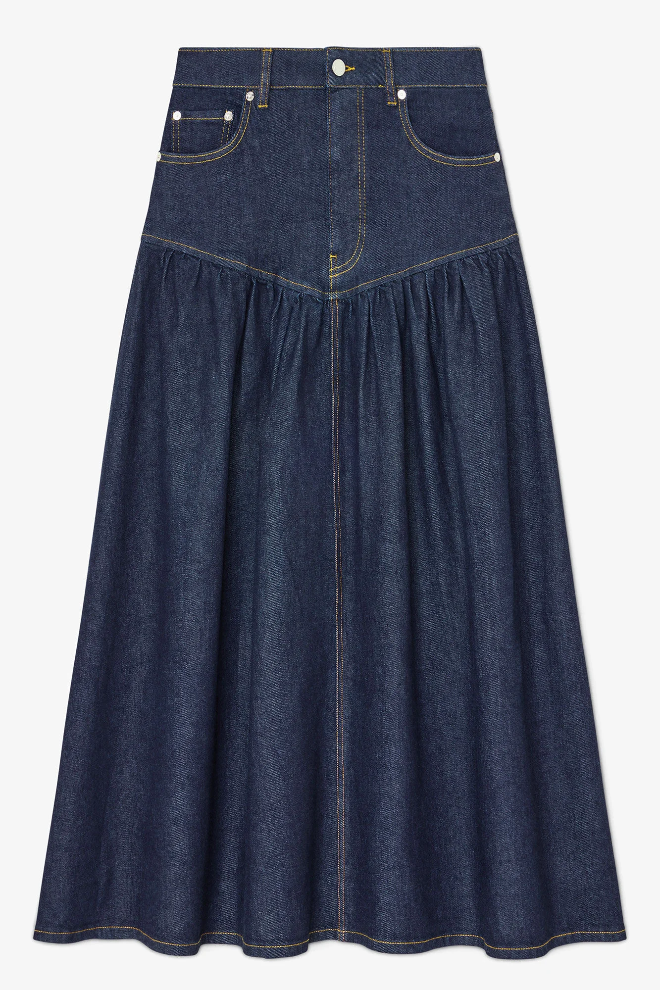 This skirt features a drop waist design, button and zip closure and multiple pockets. DETAILS - 81% Organic Cotton, 14% Lyocell, 3% Elastomultiester T400, 2% Recycled Elastane Learn more about our materials - Lining composition: 100% Organic Cotton - Drop waist design - Button and zip closure - Pockets: Side Pockets, back pockets - GANNI logo patch Made in: Turkey Product ID: A1090248 SIZE & FIT - Slim fit - Long - Assa is 5'9" and wears a size US 4