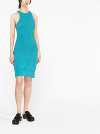 sleeveless knitted dress GANNI channels its penchant for contemporary design with this sleeveless dress, standing out with a vibrant teal blue colourway and fuzzy brushed finish. Highlights - Teal blue - Alpaca wool-blend - Brushed finish - Round neck - Rear button fastening - Sleeveless - Straight hem Imported Composition Alpaca Wool 52%, Polyamide 32%, Virgin Wool 13%, Spandex/Elastane 3% SIZE & FIT Model measurements Height 5 ft 11 in(1.8 m) Bust/Chest 31.49 in(80 cm) Hips 35.43 in(90 cm) Waist 25.19 in(64 cm) Measurement HIPS 30.7 in(78 cm) LENGTH 33.85 in(86 cm) WAIST 22.83 in(58 cm) Washing instructions Hand Wash