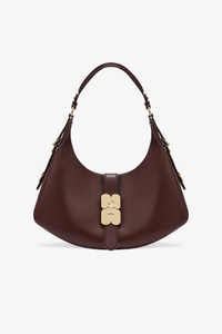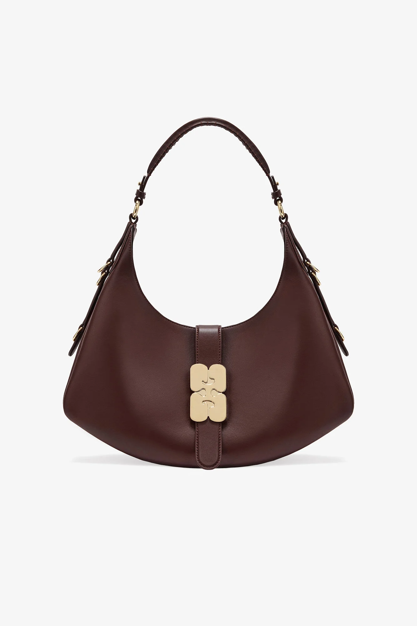 This bag features a soufflet-style silhouette, a shoulder strap and D-ring detailing at the side. The bag has a closure tab with the signature GANNI Butterfly clasp in gold-tone, 1 main compartment and an inside open pocket. DETAILS - 65% recycled leather, 19% polyurethane fibre, 16% polyester Learn more about our materials - Lining composition: 85% Recycled Polyester 15% Polyester - Soufflet-style silhouette - Shoulder strap - Gold-tone GANNI Butterfly logo - D-rings detailing - One compartment - Inside open pocket Made in: China Product ID: A7302 SIZE & FIT - Strap length: 27 cm - Height: 19 cm - Width: 37 cm - Depth: 9 cm - Designed to hold an iPhone 16 Pro Max, wallet, sunglasses, keys, water bottle, tablet or pouch