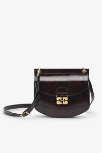 This Small Apo-G Bag comes in a burgundy colour with a snake print finish. The bag features a magnetic closure with a GANNI Butterfly gold-tone clasp and a detachable strap, allowing for versatile wear as a shoulder bag or clutch. The compact interior has a slip pocket and three main compartments, one of which has a zip closure. DETAILS - 52% recycled leather, 27% polyester, 21% polyurethane fibre. Learn more about our materials - Adjustable and removable shoulder strap - GANNI Butterfly gold-tone clasp - Magnetic closure - Three main compartments, one equipped with a zip closure - Slip pocket Made in: China Product ID: A6348