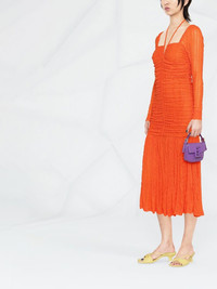 square-neck long-sleeve dress Ganni is renowned for its minimalist design, which is reflective of the brand's Scandinavian roots. This long-sleeve dress from the SS22 collection features a tonal colourway and textured finish, which adds a contemporary edge to the design. Highlights - Orange - Ruched bodice - Lace embroidery - Halterneck tie fastening - Semi-sheer construction - Flared skirt - Long sleeves - Mid-length Imported Composition Outer: Recycled Polyamide 67%, Polyamide 30%, Spandex/Elastane 3% Lining: Polyamide 100% SIZE & FIT Model measurements Height 5 ft 11 in(1.8 m) Bust/Chest 31.49 in(80 cm) Hips 35.43 in(90 cm) Waist 25.19 in(64 cm) Measurement HIPS 29.13 in(74 cm) LENGTH 45.66 in(116 cm) WAIST 23.62 in(60 cm) FittingInformation This piece fits true to size. We recommend you get your regular size Designed for a close fit at the bust, waist and hips Made with a mid-weight fabric Washing instructions Hand Wash
