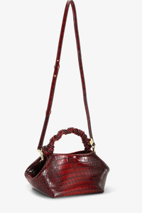 This bag features a croc-embossed texture, a hexagonal shape, a braided top handle with a braided knot and an adjustable and removable shoulder strap. The bag has an internal magnetic closure, an embossed logo, two compartments and a flat card pocket. DETAILS - 52% recycled leather, 27% polyester, 21% polyurethane fibre. Learn more about our materials - Lining composition: 65% Recycled Cotton 35% Cotton - Croc-embossed texture - Hexagonal shape - Braided top handle with braided knot - Adjustable and removable shoulder strap - Internal magnet closure - Gold-tone metallic dice with GANNI logo - GANNI embossed logo - Two compartments - Flat card pocket Made in: China Product ID: A6474 SIZE & FIT - Strap length: 50 - Height: 14 - Width: 28 - Depth: 17