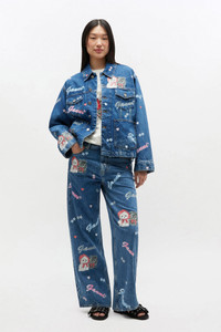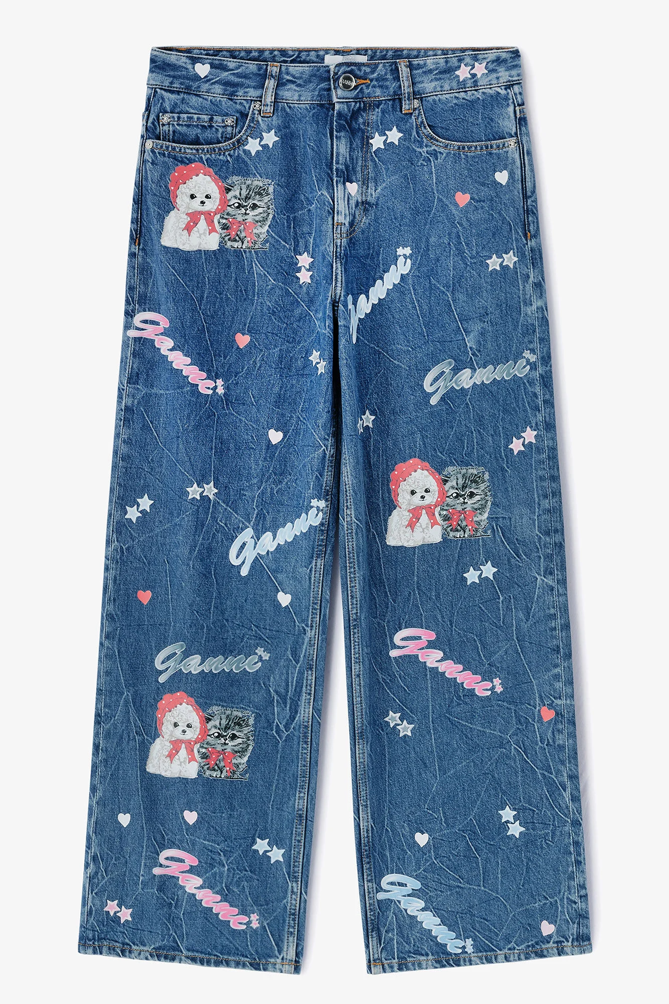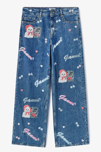 These jeans in stone wash feature a GANNI starry animal print, zip and button closure, 5 pockets, belt loops, GANNI logo patch on back pocket. DETAILS - 100% organic cotton. Learn more about our materials - Stone washed - GANNI starry animal print - Button and zip closure - Belt loops - 5 pockets - GANNI logo patch at back pocket Made in: Tunisia Product ID: J1916 SIZE & FIT - Relaxed fit - Lisa Lu is 5’10” and wears a size 27 - For personalised guidance on sizing and fit, contact our Customer Service team - here - .