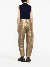 Stary gold-foiled jeans GANNI’s AW23 collection re-vamps some of its popular archival styles like these Stary jeans – a concept inspired by the transformative lifetime of butterflies. Seen on the runway, they’re cut to a voluminous curved shape from organic denim for a lower impact then fully coated in gold foiling for a metallic finish. Highlights - Gold-tone - Organic cotton - Denim - Foiled finish - High waist - Belt loops - Concealed fly and button fastening - Classic five pockets Imported Composition Organic Cotton 100% SIZE & FIT Model measurements Height 5 ft 10 in(1.78 m) Bust/Chest 30.7 in(78 cm) Hips 34.64 in(88 cm) Waist 23.22 in(59 cm) Washing instructions Machine Wash