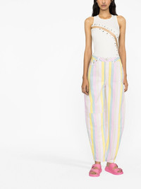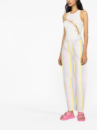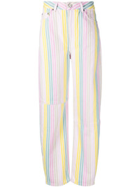 Stary striped tapered jeans GANNI's Stary jeans showcase the brand's playful style through their multicolour stripes. They boast a voluminous curved-leg silhouette, adding to that fun aesthetic. Highlights - Multicolour - Organic cotton - Denim - Vertical stripe print - Mid-rise - Belt loops - Button fly fastening - Classic five pockets - Tapered leg Imported Composition Organic Cotton 100% SIZE & FIT Model measurements Height 5 ft 10 in(1.78 m) Bust/Chest 31.49 in(80 cm) Hips 35.03 in(89 cm) Waist 23.62 in(60 cm) Measurement FRONT RISE 12.59 in(32 cm) INSIDE LEG 28.74 in(73 cm) HIPS 40.94 in(104 cm) FittingInformation Designed for a tapered fit, these jeans allow a close fit at the waist and a loose unrestricted fit over the leg with a closer fit towards the ankle Sturdy and hard-wearing, this denim piece offers no stretch This piece fits true to size – take your usual size Washing instructions Machine Wash