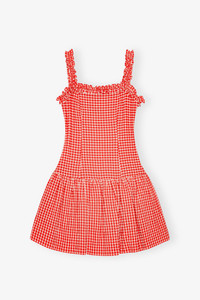 RED STRETCH SEERSUCKER STRAP RUFFLE MINI DRESS