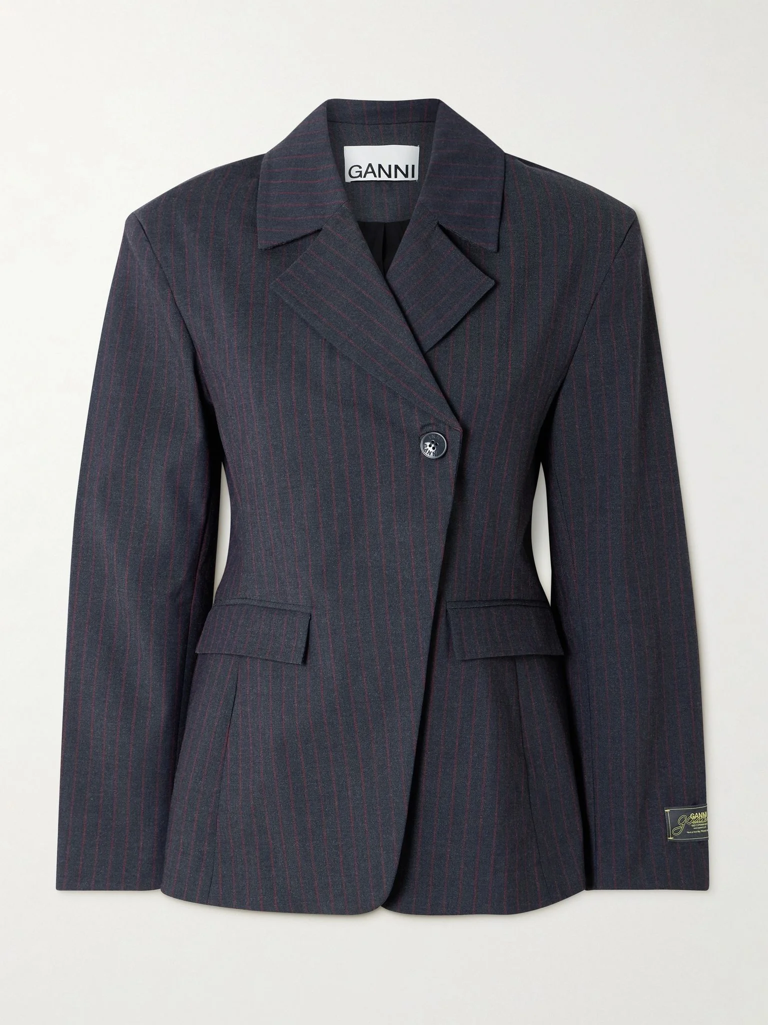 GANNI's blazer draws on traditional tailoring, but the askew front button and fine red pinstripes add a playful, off-beat touch. It has a relaxed fit on the shoulders and a subtly cinched waist. Size & Fit GANNI follows its own size guide, please refer to below: - EU 32 = UK 4/ US 0/ FR 34/ IT 38 - EU 34 = UK 6/ US 2/ FR 36/ IT 40 - EU 36 = UK 8/ US 4/ FR 38/ IT 42 - EU 38 = UK 10/ US 6/ FR 40/ IT 44 - EU 40 = UK 12/ US 8-10/ FR 42/ IT 46 - EU 42 = UK 14/ US 10-12/ FR 44/ IT 48 - EU 44 = UK 16/ US 14/ FR 46/ IT 50 - EU 46 = UK 18/ US 16/ FR 48/ IT 52 - EU 48 = UK 20/ US 18/ FR 50/ IT 56 - EU 50 = UK 22/ US 20/ FR 52/ IT 58 - EU 52 = UK 24/ US 22/ FR 54/ IT 60 - Fits true to size, take your normal size - Designed for a slim fit - Mid-weight, non-stretchy fabric - Model is 177cm/ 5'10" and is wearing the designer's size 36 Model measurements: - Bust: 85cm/ 33” - Waist: 66cm/ 26” - Hip: 92cm/ 36” Details & Care - Dark-gray and red polyester, viscose and elastane-blend - Button fastening at front - 62% polyester, 32% viscose, 6% elastane - Partially lined - Machine wash or dry clean - Designer color: Phantom