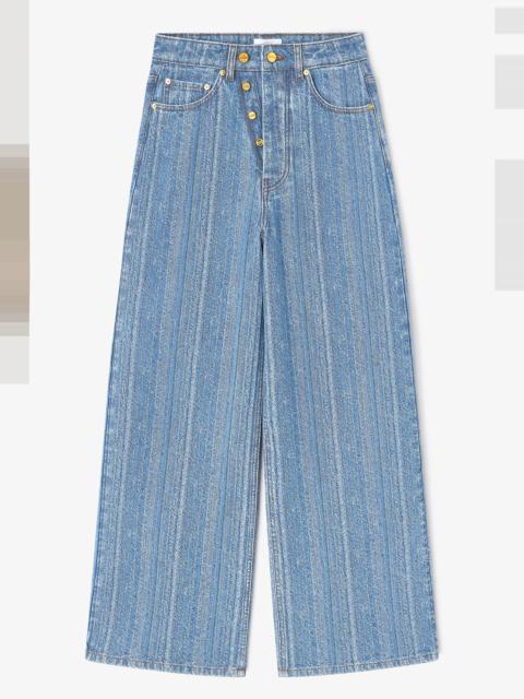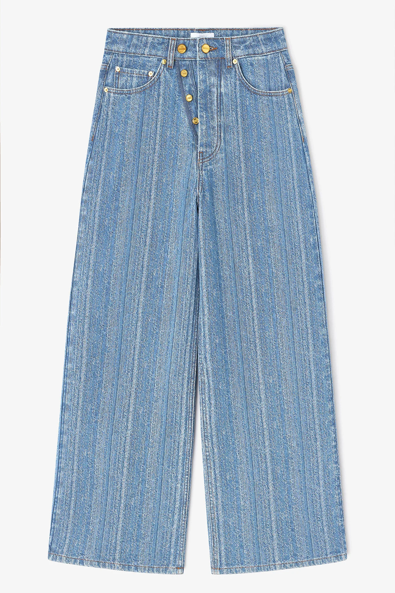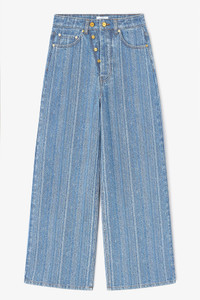 These jeans in striped denim feature a zip and button closure, 5 pockets, belt loops and a GANNI logo patch on back pocket. DETAILS - 100% organic cotton. Learn more about our materials - Lining composition: 100% Organic Cotton - Striped denim texture - Button and zip closure - Belt loops - 5 pockets - GANNI logo patch Made in: Turkey Product ID: J1882 SIZE & FIT - Relaxed fit - Yaniris is 5’11” and wears a size US 4 - For personalised guidance on sizing and fit, contact our Customer Service team - here - .