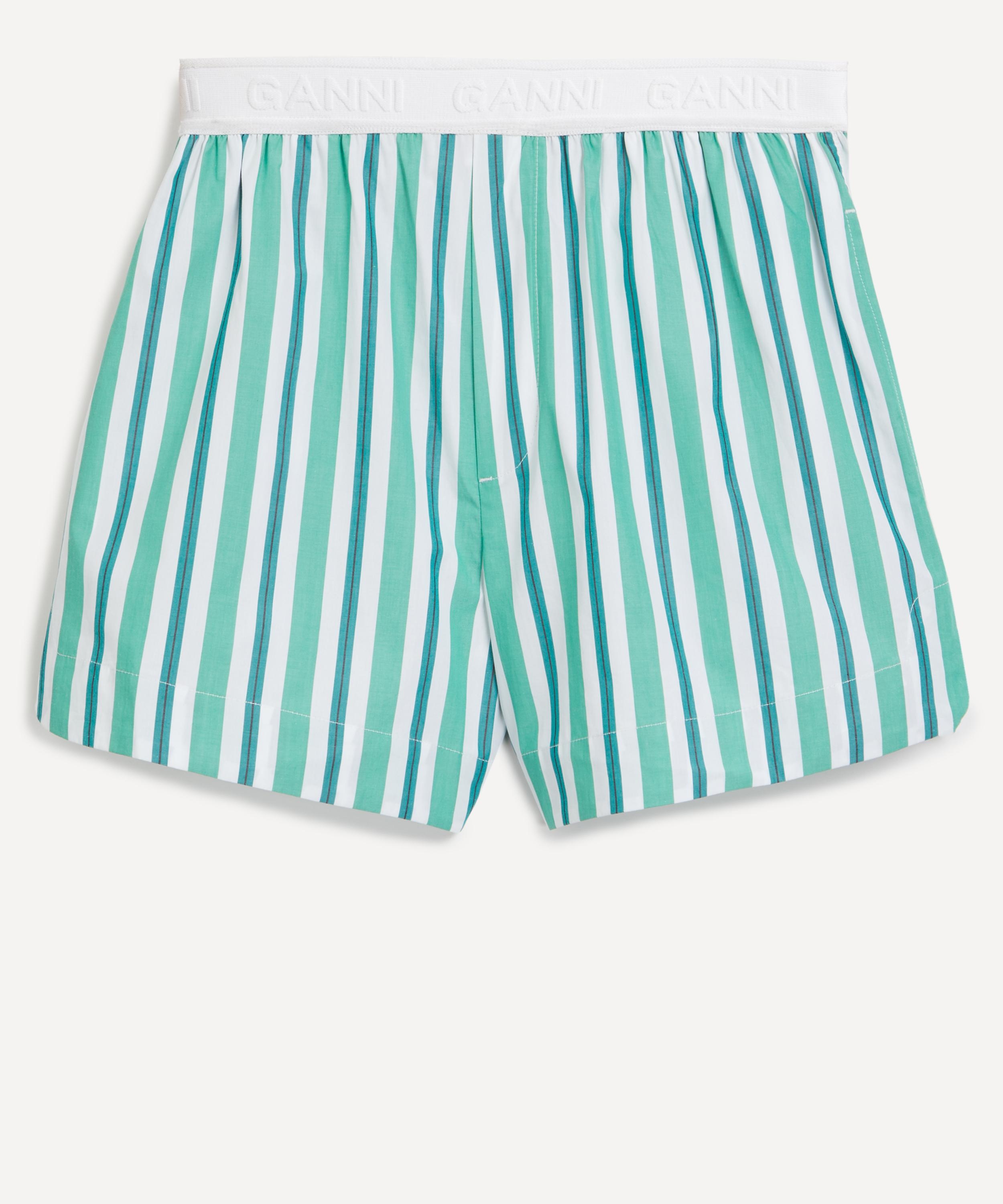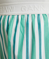 DETAILS Elasticated shorts Pure cotton Relaxed fit Green stripe print Elastic waistband with GANNI logos Decorative pocket at the back Pull-on style SIZE & FIT Model is 180cm/5'9"; Chest: 90cm; Waist: 63.5cm; Hips: 91.5cm and wears size 8 COMPOSITION & CARE 100% Cotton Machine wash, cold