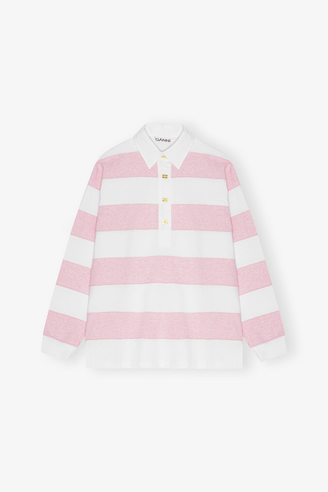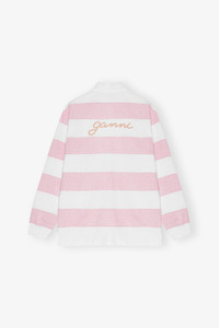 This Striped Heavy Cotton Polo Shirt features wide pink and white horizontal stripes, a buttoned collar with GANNI Butterfly buttons, and a GANNI logo embroidered across the shoulders. DETAILS - 100% organic cotton. Learn more about our materials - Collar - Long sleeves - Button closure - GANNI Butterfly buttons Made in: Portugal Product ID: T4121 SIZE & FIT - Relaxed fit - Renda is 5’10” and wears a size S