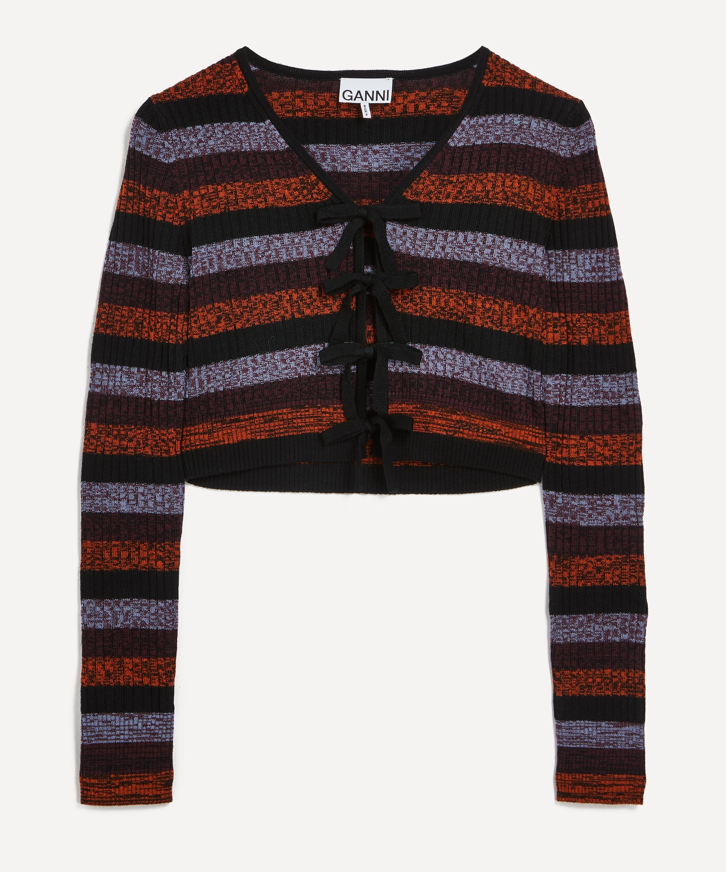 DETAILS Striped merino ribbed cropped cardigan V-neckline Tie front Long sleeves Stripe pattern Embroidered Ganni lettering to the hem SIZE & FIT Model is 175cm/5’9" ; Chest: 84cm; Waist: 65cm; Hips: 92cm and wears size 8 COMPOSITION & CARE 100% Merino Wool Hand Wash. Do not tumble dry.