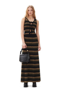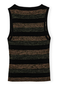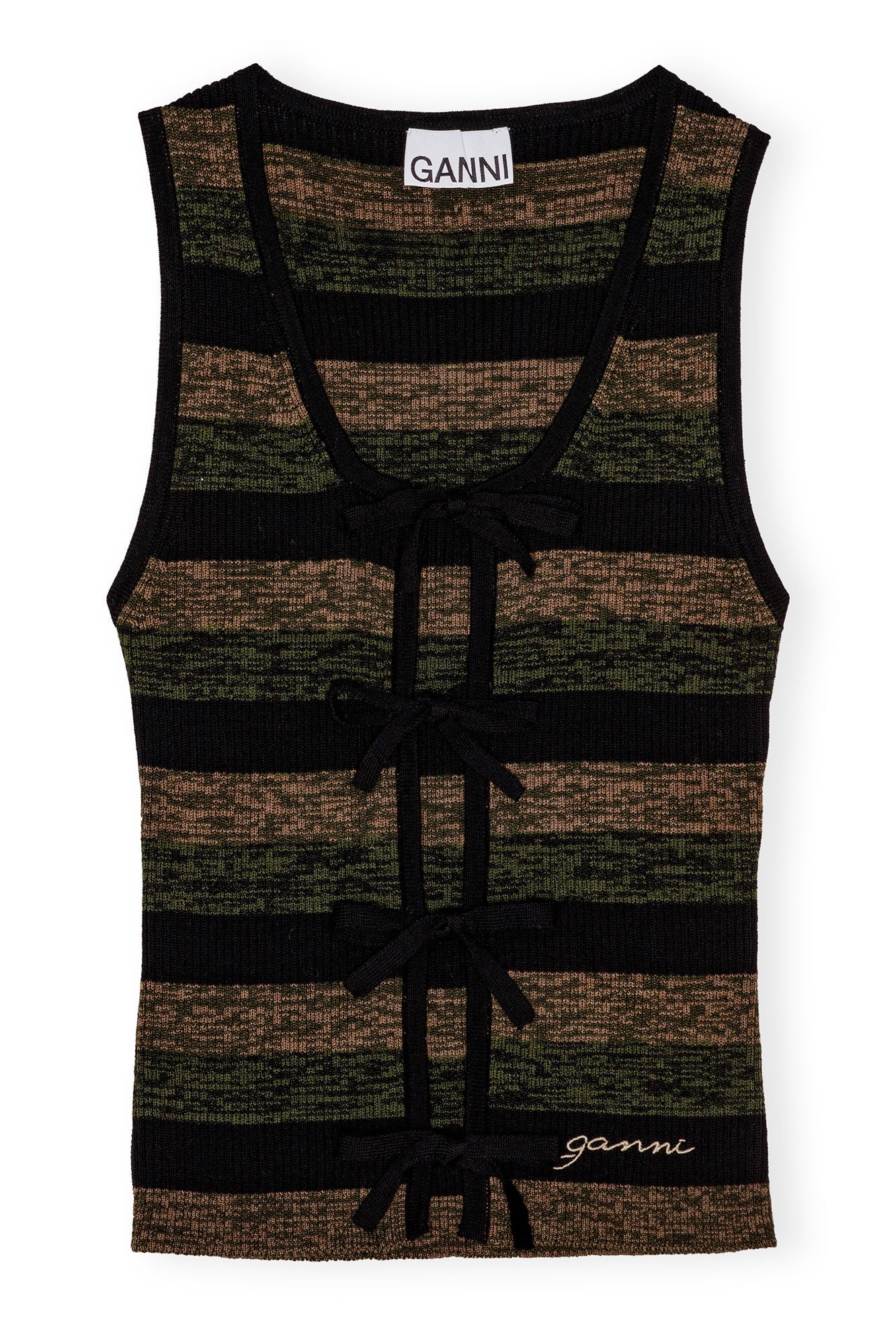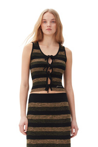 This Striped Ribbed Merino Wool Tie Top features a u-neckline, an open front with tie bands and an embroidered GANNI logo. DETAILS - 100% merino wool. Learn more about our materials - U-neckline - Open front with tie bands - Embroidered GANNI logo Made in: China Product ID: K2291 SIZE & FIT - Designed for a slim fit throughout, skimming the body without clinging - Fits true to size, take your normal size - Vigga is 5’9” and wears a size S