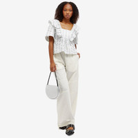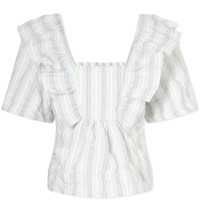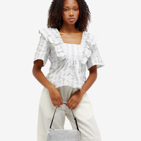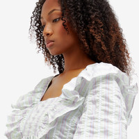 Danish label GANNI shows that Scandi style doesn’t have to be all about simplicity. This seersucker blouse proves that more is more when it comes to ruffles, with its ruffle detailing across the shoulders. Style this blouse with one of GANNI’s flowy skirts for a romantic vibe. - 53% Organic Cotton, 43% Polyester, 3% Viscose, 1% Elastane - Square Neck - Smock Back