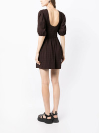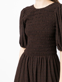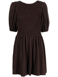 striped smocked mini dress Highlights - Coffee brown - Seersucker texture - Horizontal stripe pattern - Smocked panel - Open back - Round neck - Short puff sleeves - Flared skirt Imported Composition Outer: Recycled Polyester 51%, Polyamide 43%, Elastane 6% SIZE & FIT Model measurements Height 5 ft 11 in(1.8 m) Bust/Chest 28.34 in(72 cm) Hips 35.43 in(90 cm) Waist 23.62 in(60 cm) FittingInformation This piece fits true to size. We recommend you get your regular size Designed for a close fit at the bust and waist, but loose at the hip Made with a mid-weight stretch fabric Washing instructions Machine Wash